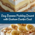 Spread the cream cheese and whipped topping mixture evenly over the graham cracker crust. Following that, carefully layer the softened vanilla pudding on top, making sure it’s smooth and covers the cream cheese mixture completely. Finally, arrange the sliced bananas over the pudding layer, adding a fresh, fruity burst to the dessert.