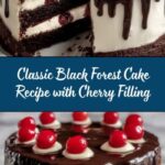This classic Black Forest Cake recipe features moist chocolate cake layers soaked with cherry brandy, layered with rich whipped cream and luscious cherry filling. Topped with chocolate shavings and fresh cherries, it is an elegant and indulgent dessert perfect for special occasions.