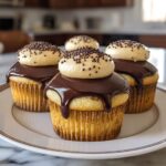 Here’s where the fun really begins. After the cupcakes have cooled, use a small knife or cupcake corer to remove a small cylinder of cake from the center of each cupcake. Fill each hollow with a spoonful of the silky pastry cream, then dip each cupcake top into the chocolate ganache, allowing the excess to drip down the sides for that signature glossy finish. Let them set slightly so the ganache firms up, and you’ve got yourself an irresistible treat that’s ready to impress.