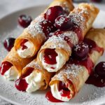 Delightful Cherry Cream Cheese Egg Rolls featuring a creamy blend of cream cheese, powdered sugar, and vanilla, combined with sweet cherry pie filling wrapped in crispy egg roll wrappers. These can be fried for a traditional golden crisp or baked for a lighter option, perfect as a dessert or sweet snack.