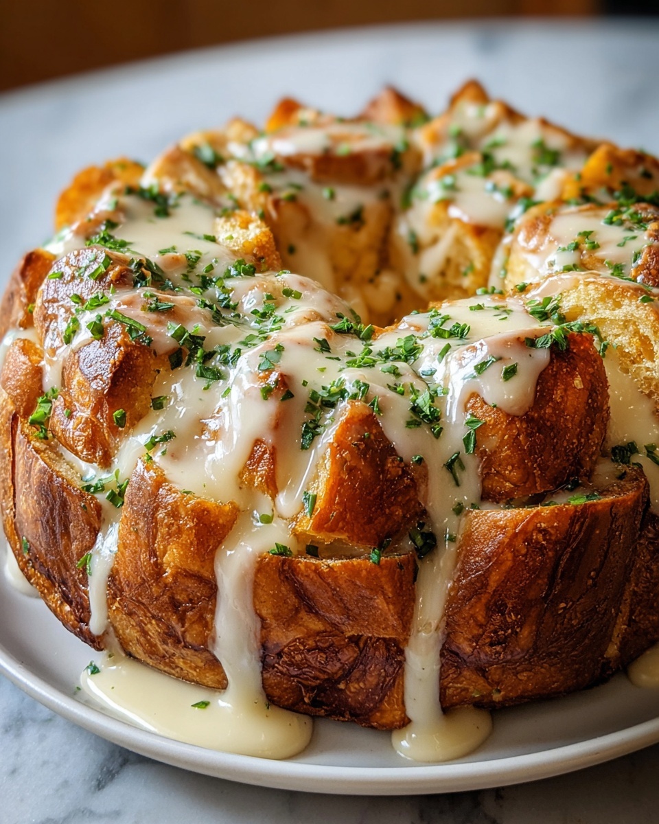 Patience is a virtue here! Let the bread cool for 5 to 10 minutes so it firms up slightly, making it easier to flip the pan onto your serving plate. The result is a gorgeous, pull-apart Chicken Alfredo Monkey Bread ready to wow your guests or family with every cheesy, buttery bite.
