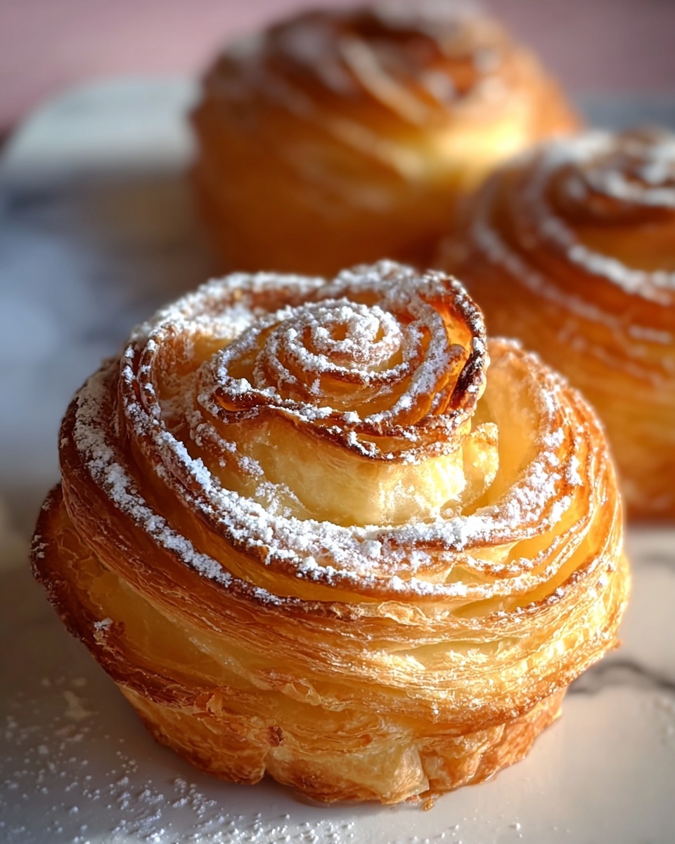 - Shape the Cruffins: Carefully roll each puff pastry sheet lengthwise into a tight log. Slice each log into 6 equal pieces, creating individual cruffin portions.