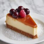 - Chill & Serve: Carefully remove the cheesecake from the water bath. Run a thin knife around the edge of the pan to loosen the cheesecake. Let it cool to room temperature, then cover and refrigerate for at least 4 hours, preferably overnight. When ready to serve, slice the cheesecake chilled. Optionally top with fresh berries, whipped cream, or caramel sauce for extra indulgence.