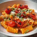 This Creamy Tomato Garlic Pasta features a rich and flavorful sauce made from sautéed garlic and cherry tomatoes, infused with white wine and cream, and perfectly seasoned with smoked paprika and chili flakes. Tossed with al dente rigatoni and garnished with fresh parsley and Parmesan, it offers a comforting and indulgent Italian-inspired meal that comes together easily on the stovetop in just 40 minutes.