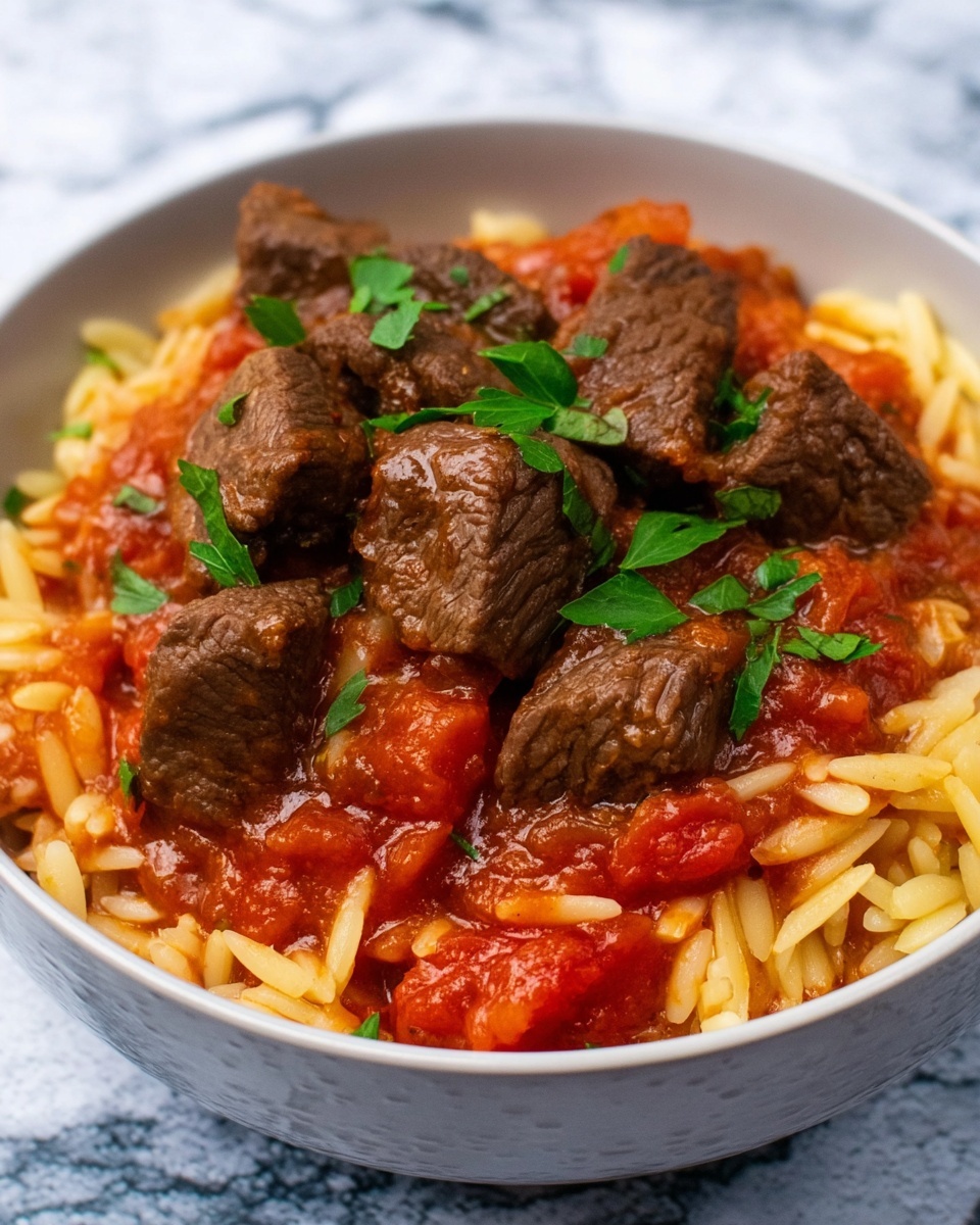 Yes! Brown the beef and sauté the aromatics first, then transfer everything to a slow cooker. Cook on low for 6-8 hours until the beef is tender, adding orzo in the final 30 minutes so it doesn’t overcook.