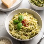 This vibrant Green Goddess Orzo recipe features tender orzo pasta cooked in a creamy, herb-packed coconut milk sauce. Blended with fresh basil, spinach, parsley, and a hint of lemon, this dish is a flavorful and satisfying vegetarian meal perfect for lunch or dinner. The toasting of orzo before simmering adds a subtle nuttiness, while the luscious sauce coats every bite with a fresh, green goodness. Garnished with a drizzle of olive oil, chili flakes, and fresh basil, it offers a delightful balance of creaminess and brightness.