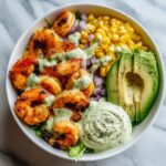 - Assemble the Bowl: Place the grilled shrimp in serving bowls, top with a generous scoop of the avocado corn salsa, and drizzle with the creamy sauce. Serve immediately to enjoy the freshness and vibrant flavors.