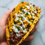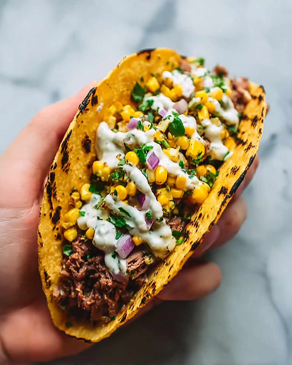 - Assemble the Tacos: On each crispy tortilla, place a generous amount of the sliced steak, top with the corn salsa, and drizzle with the prepared Elote sauce. Serve immediately while warm and enjoy.