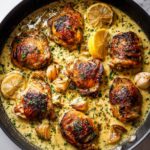 This Herb Roasted Chicken in Creamy Garlic Herb Sauce is a comforting and flavorful dish featuring tender seared chicken pieces roasted in a rich, creamy sauce loaded with mushrooms, herbs, and baby potatoes. The sauce is infused with garlic, fresh sage, parsley, and a hint of lemon, creating a perfect balance of savory and tangy flavors. Ideal for a hearty family dinner, this recipe combines pan-searing and oven roasting to deliver juicy chicken with crispy skin and a luscious mushroom-potato sauce.