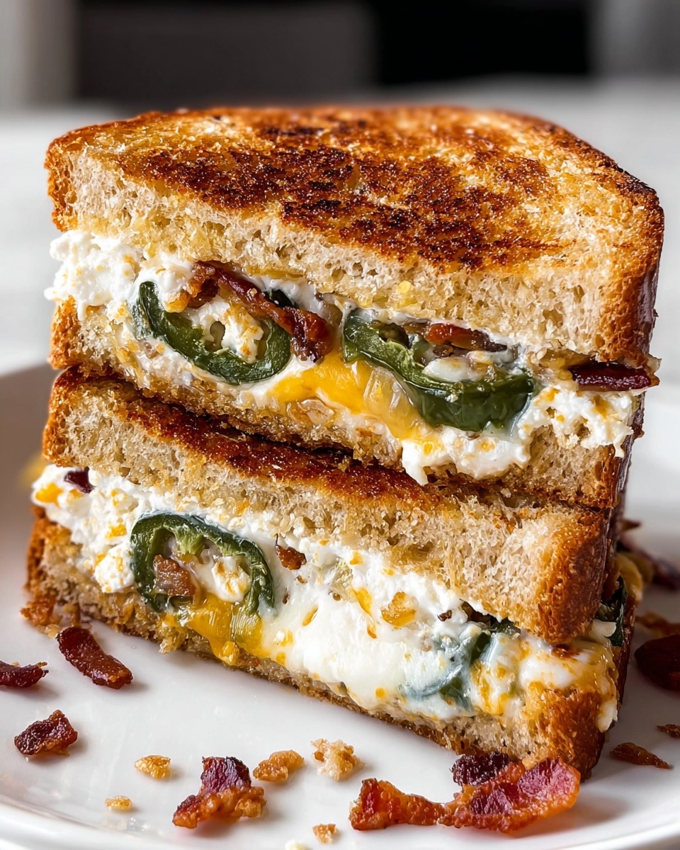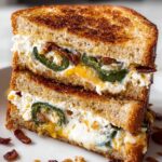 A spicy and creamy twist on the classic grilled cheese, this Jalapeño Popper Grilled Cheese sandwich features roasted jalapeños blended into a zesty cream cheese spread, layered with crispy bacon and a blend of cheddar and Monterey Jack cheeses, all grilled to golden perfection. Perfect for a flavorful lunch or snack that combines creamy, spicy, and smoky elements.