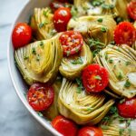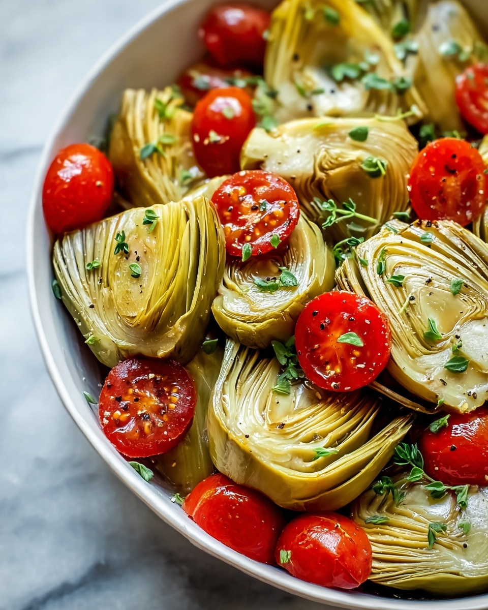 A refreshing and flavorful Mediterranean Artichoke Salad combining tender artichoke hearts, juicy cherry tomatoes, chickpeas, and a zesty lemon-Dijon dressing. Perfect as a light meal or side dish, this no-cook salad is quick to prepare and full of vibrant, wholesome ingredients.