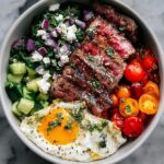 This vibrant Mediterranean Steak Bowl combines grilled tender steak with fresh vegetables, tangy feta, and hearty quinoa for a nutritious and flavorful meal perfect for a quick lunch or dinner.