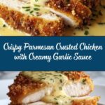 This Parmesan Crusted Chicken with Creamy Garlic Sauce is a deliciously crispy and savory dish featuring boneless chicken breasts coated in a flavorful Parmesan and breadcrumb crust, pan-fried to golden perfection, and served with a rich and silky garlic cream sauce. Perfect for a comforting weeknight dinner or special occasion.