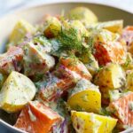 Cook your potatoes in boiling salted water for about 15 to 20 minutes until you can easily pierce them with a fork. This ensures they’re tender enough to absorb the dressing, but still firm enough to hold their shape in the salad.