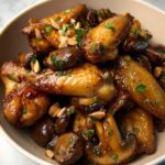 Serve the wings and mushrooms on a rustic wooden platter adorned with fresh herbs like cilantro or Thai basil for a vibrant pop of green. Alternatively, portion them into individual small bowls for a fun sharing experience that encourages everyone to dig in and savor the flavors firsthand.