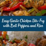 A flavorful and quick Sizzling Garlic Chicken Stir-Fry featuring tender chicken strips cooked with colorful bell peppers and onions in a savory garlic sauce, served over steamed white rice. Perfect for a nutritious weeknight dinner that’s both vibrant and satisfying.