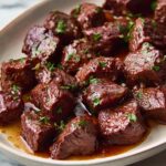 Once the slow cooker signals it’s done, sprinkle freshly chopped parsley over the steak bites for a fresh, herby touch. This simple garnish adds a delightful contrast to the richness of the dish and makes it look as good as it tastes.