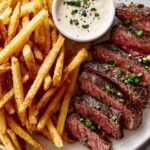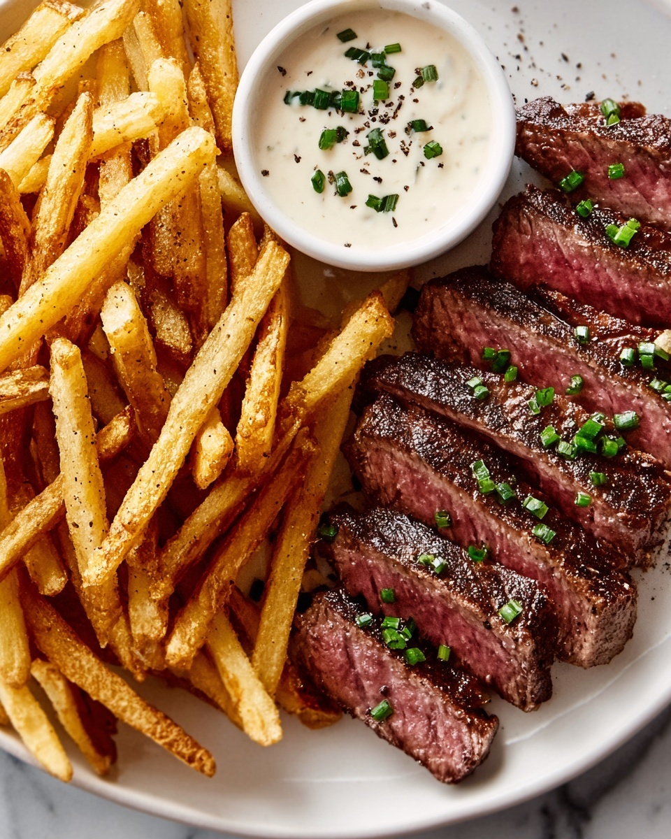 Once seared, transfer the steaks to a plate and let them rest for about 5 minutes. This resting period allows the juices to redistribute throughout the meat, ensuring every bite is tender and flavorful. Slice the steaks against the grain and serve immediately alongside your golden fries for a meal that’s as elegant as it is satisfying.