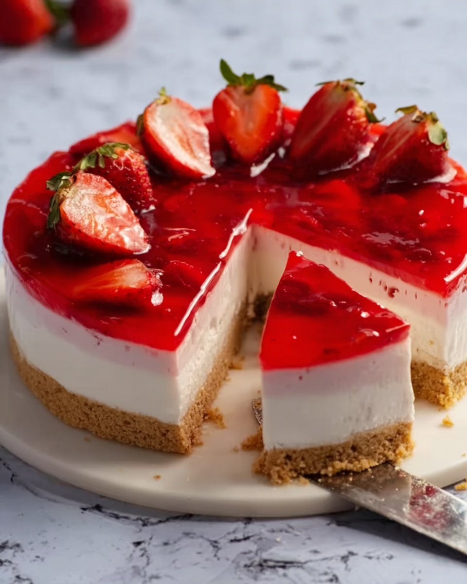 Use a sharp knife that you warm under hot water and wipe clean between cuts. This simple trick helps the knife glide smoothly through the creamy filling and strawberry topping for neat, attractive slices.