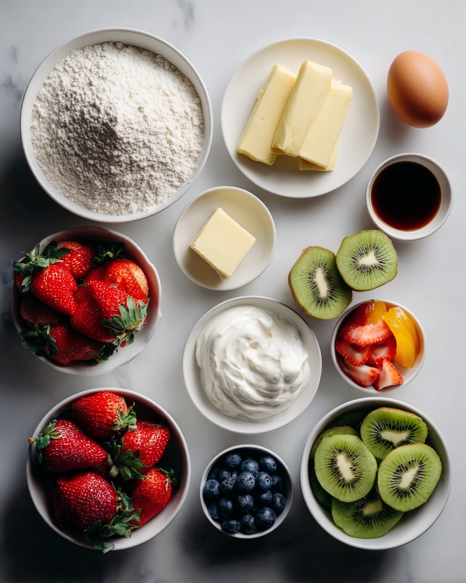 This recipe keeps things wonderfully simple with pantry staples that come together beautifully. Each ingredient plays a vital role, whether it’s the sweet and tender cookie crust, the creamy tang of the frosting, or the vibrant freshness of the fruit toppings that give this dessert its signature pop of color and flavor.